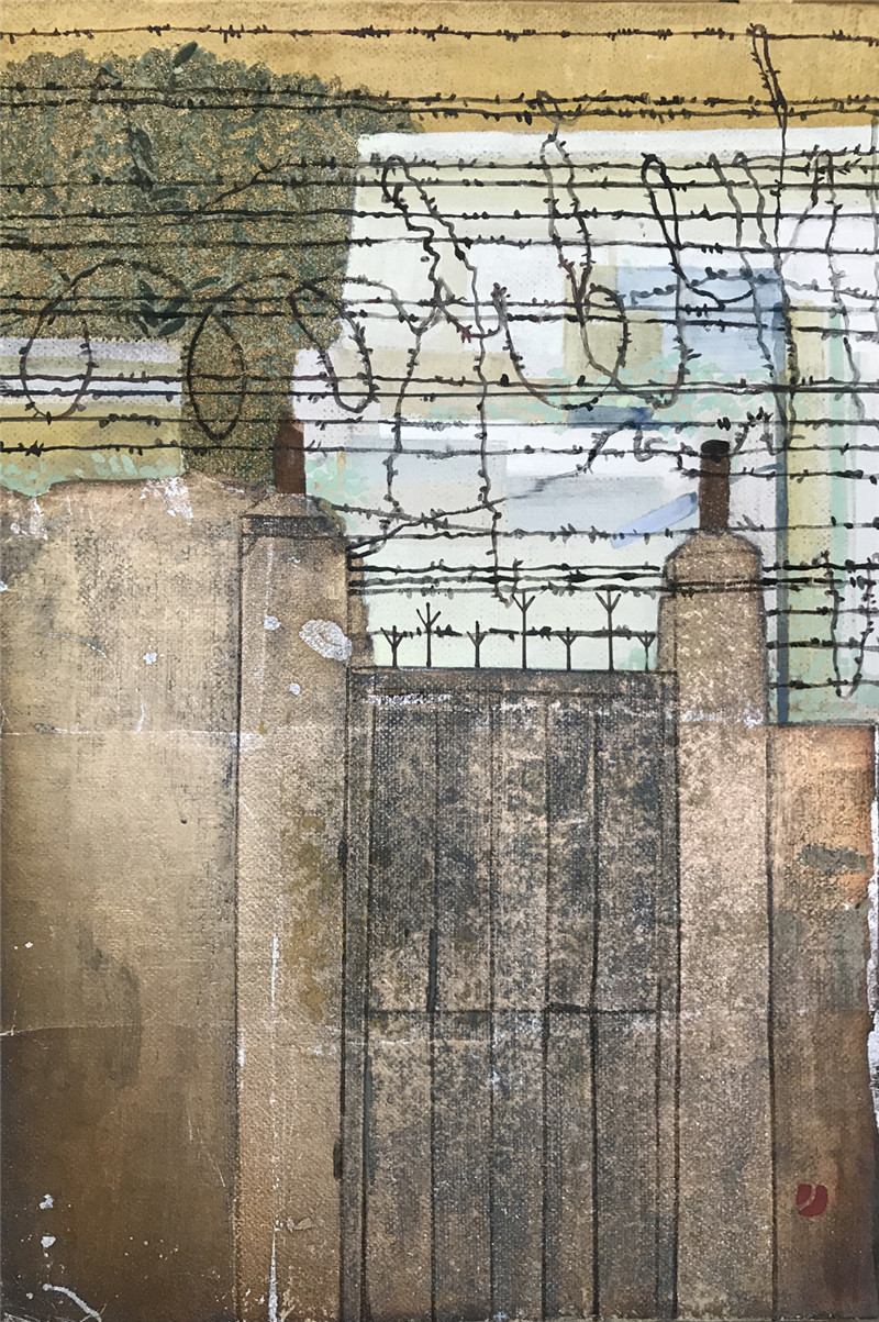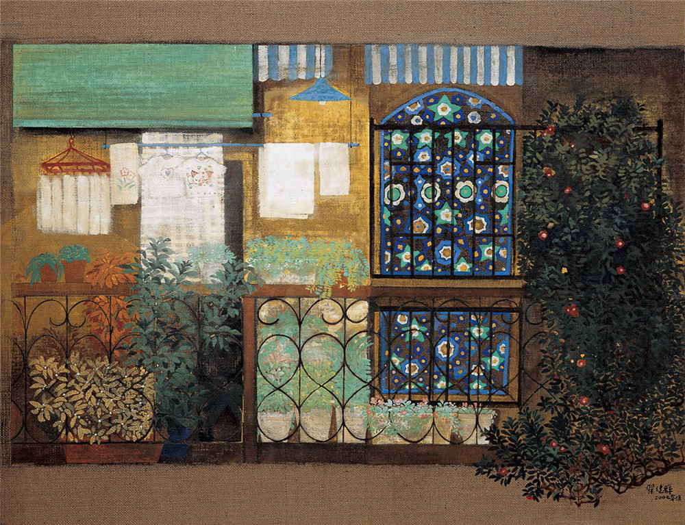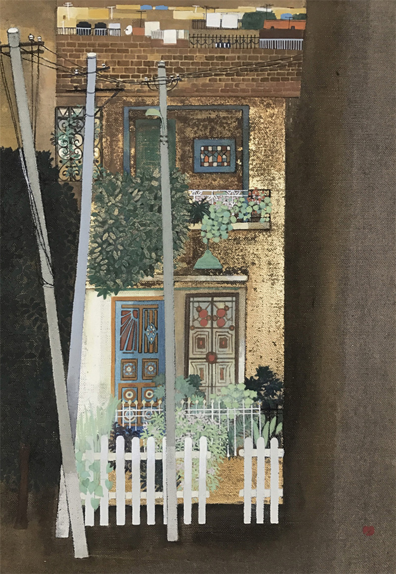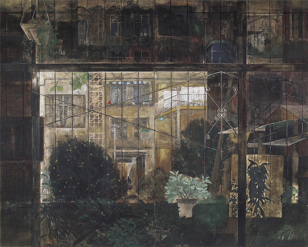 在日本求学期间,建群透过京都林立的高楼、繁华的都市,试图寻找现实与内心的双重家园,由于存在的此时此地,他并没有采用超现实的物象组合与技术语言,而是轻轻地推开一扇窗,在平视与略微的俯视之间投射出自己的家园之思,那熟悉的窗、楼道、草木以及渐远的楼群,都成为家园情思的寄寓;写实的、甚至巨细不漏的描绘,加之岁月时间留下的斑驳残痕,这一切都熟悉而遥远;交织的窗格、沉郁而宁静的色调,家园在现实的阻隔中深深烙刻在心灵的深处。