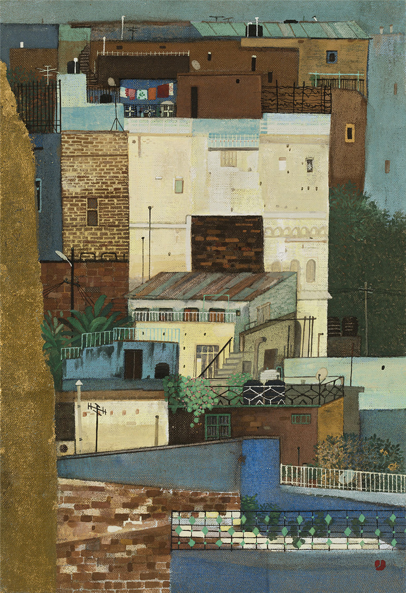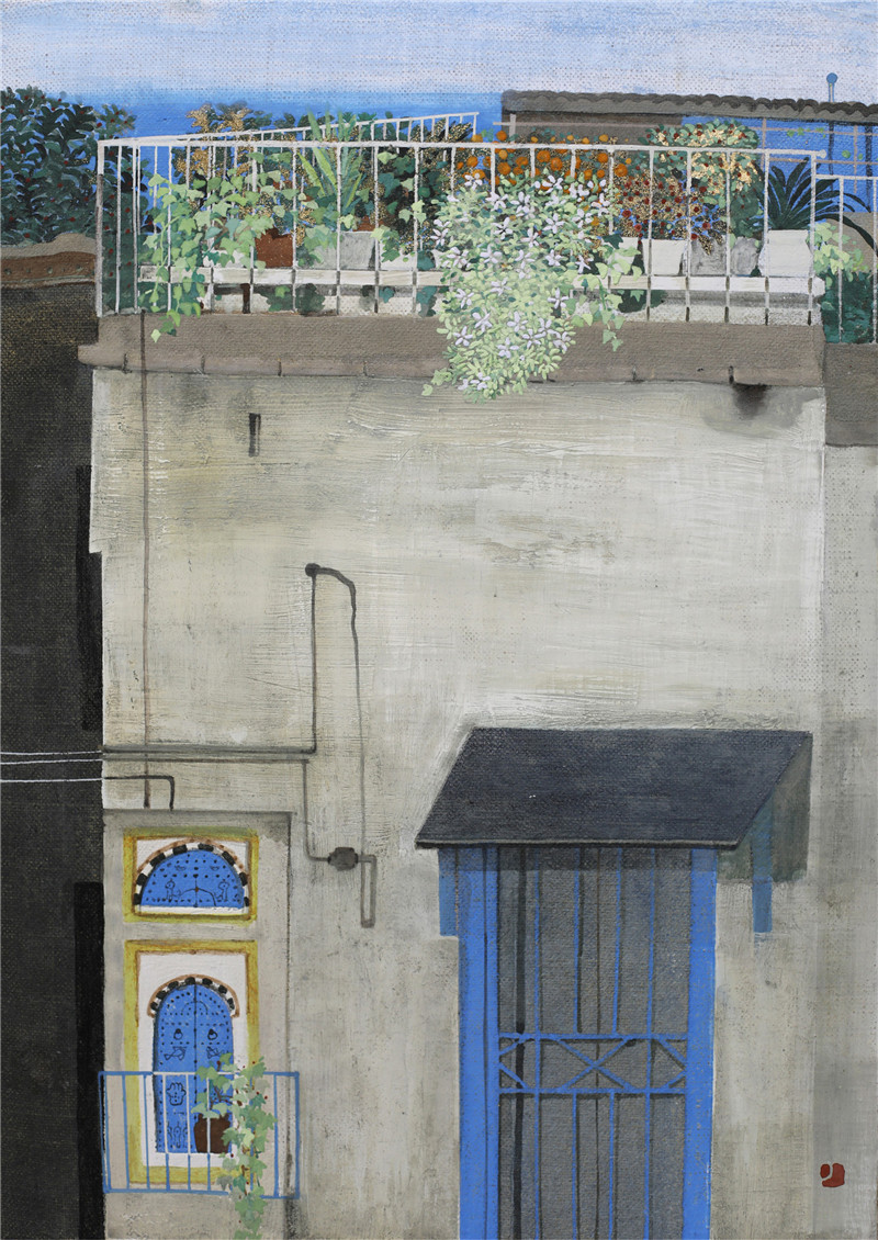 《美好家园系列——蓝城印象之九》73×50cm 麻布岩彩 2017年