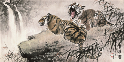 他题曰《版纳雄风》的一个画面,画的是一只从古树老林中走出来的老虎,步武凛然,仿佛是武侠小说中孤胆英雄的现身。其他取题《长啸》、《初醒图》、《霜晨月》、《君临山野》、《渴饮白山泉》等作品,所画老虎,也皆有如大野猛士,令人观而壮之。