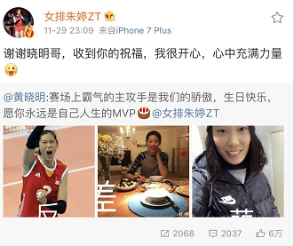 朱婷的偶像黄晓明在29日晚上也发出了向朱婷“贺寿“的微博,”黄教主“说:赛场上霸气的主攻手是我们的骄傲,生日快乐,愿你永远是自己人生的MVP,不少网友评论,这真是追星的最高待遇了。