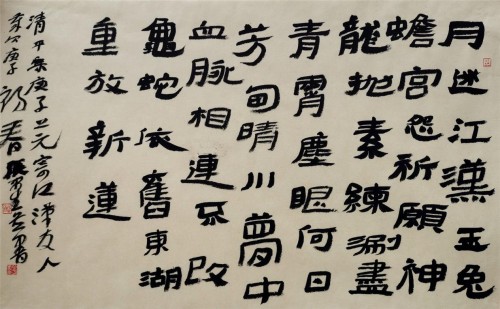 五是字法、章法中表现出的空间的丰富变化。有的作品章法犹如乱石砌墙,令其互相咬合,上下顶接,左右穿插,前后呼应,字之大小顺随其形,不必强求一律。法在其中,理在其中,道亦在其中。尤其是布白,对比強烈,夸张而不失度,率意而不悖法,持古而不泥古,求变而不妄为。熔冶有方,新意自出。虽尚不能说就巳炉火純青,但凤声辽唳,后势备足,成为文化地图中的艺朮亮点,期为时代标新。
