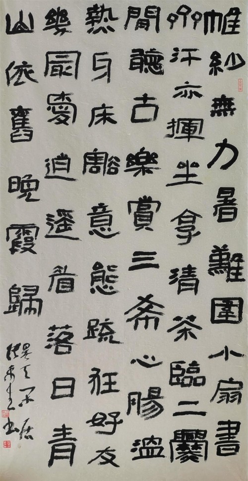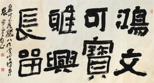 三是在不伤爨骨的情况下,从笔意、墨色、章法上,更其放胆,更其自由,从而也更趋丰富多彩。如粗笔、颤笔、澀笔、逆笔、方笔、圆笔,交相运用,变化多端;如胀墨、枯墨、湿墨、干墨、淡墨、浓墨,因势而置,缘情而施,不一而足;如大小、欹正、黑白、疏密、错纵、参差,谋局布阵,俨然成器,变化多而且正是基于这一点,才提醒张平生,在今后的书艺觅道中,一定要作到以下这二点:一是以爨立世,不改初心,万变而不离其宗;二是推陈出新,取百家之长,而熔自家之范模。把这二者糅合得恰到好处,如羚羊挂角,神化无迹,不可凑泊,这绝非易亊。然唯其难,才弥足珍贵;唯其罕,方独步书阙。好在平生正当盛年,已有如此之眼光与积淀,未来当然可期。
