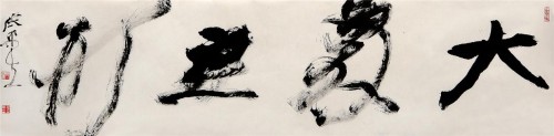 张平生爨体书法确乎达到了一种境界。“大音希声”、“大象无形”是老子哲学命题,欣赏张平生书法作品,不由得使人联想到老子揭示的这种境界。他最爱书写也最能表达他熔爨入草风韵的“大象无形”作品,无论横竖,尤以巨毫擘窼大字为代表,以此书风至美的集乐音旋律美、书法线条美、水墨韵律美的用笔已经到了和自然美融为一体的境界。天地无言,四时生焉,宇宙的运行无法用人的所见所闻去描述。而书家爨体书法所蕴含的“大音希声”“大象无形”,给书法欣赏者们带来了全新的书法艺术包蕴众美的感受,仿佛书法长河闪亮出一朵朵涟漪、一丝丝绿色吐露着初春的芬芳。