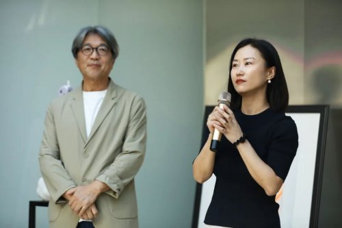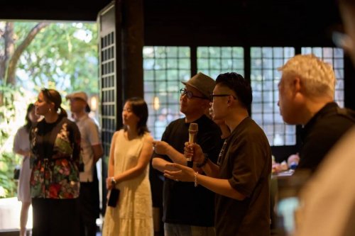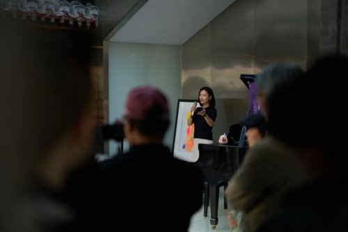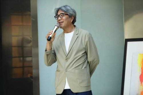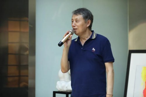 艺术家华庆 作为特邀策展人首先发言,他谈到:“龚欣之前做建筑师盖大房子的,我们可以进去的大房子开始再做这个小房子,我觉得这个创意就特别好,而且在这么短的时间,然后就可以把把作品做得比较成熟,然后后来又发展了雕塑,我就特别欣慰。还有大欢,书法很有造诣,家学渊源,然后他把这个书法变成一种颜色,我觉得他就是进入绘画和书法之间了,就可以当一个绘画来收藏了。就是书法还有颜色我觉得就特别好,所以这是我自己认为是一个非常有水平的展览。所以我也很高兴能够在这里面把作品推荐给大家,刚才说到艺术,我觉得简单的分享一下我的想法。俗话说除了生死无大事,我们出生然后到死亡,中间这一段是我们的生活,我们不管怎么努力,大的人类社会来说,还是我个人来说,如果我们有了艺术,我们的人生就会比较精彩和美好。我也祝贺这次展览能够取得巨大的成功,谢谢大家。”