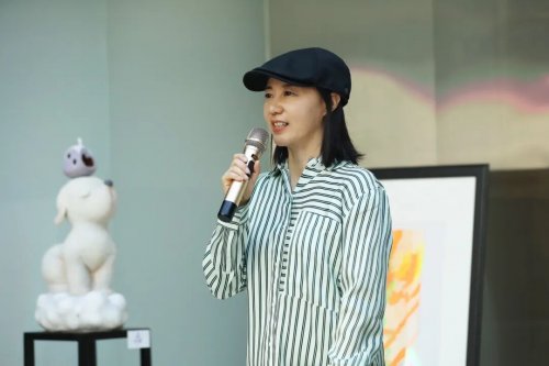 ”所以我觉得然后后来我又看到他外面去雕塑的手捏的那些小狗,因为我自己也是养狗人,我觉得他是一个非常纯粹的艺术创作者,他并不是为了自己一定要做一年做几次展览,一定要出多少个作品,最好的艺术创作,其实这个人的他自己的对生活的热爱本身,所以说我觉得他的作品非常的动人,非常的真挚,最好的作品就是真挚的感情。大欢的艺术作品,我觉得最打动我的就是刚才那幅知进退,因为他刚才在跟我解读的时候说很多的书法作品都是水墨黑白的墨色,然后他想用粉色的一个墨水来表达对女性的一种共情也好,还是致敬也好,正好在创作的时候墨被他的手给晕染开来了。因为其实女性在这个社会其实会面临很多的难处和不容易,反倒是柔软,可以战胜刚强。所以我觉得这一幅粉红色的很柔软的知进退走到了我的心中,谢谢。”