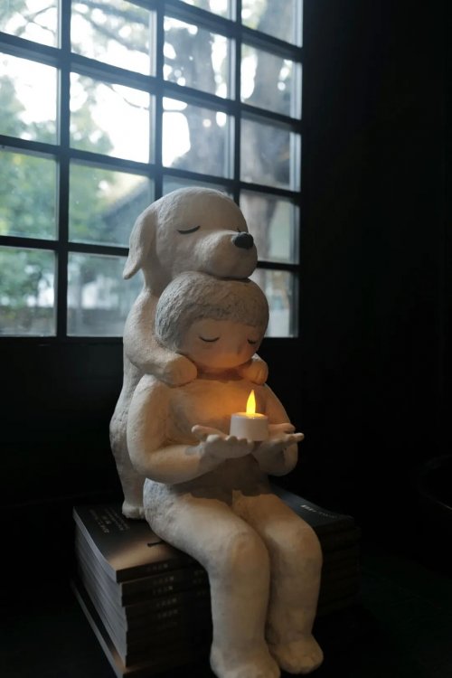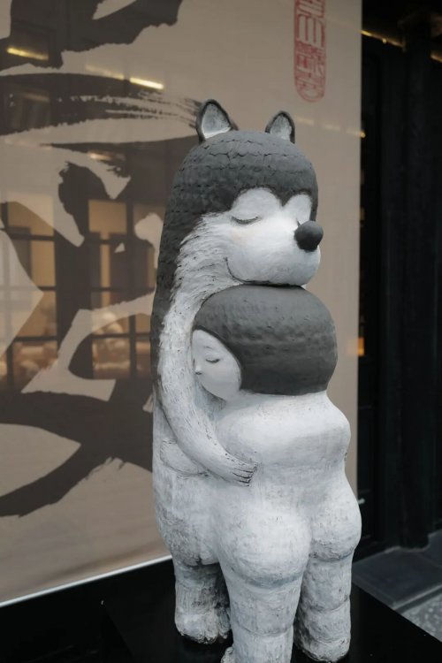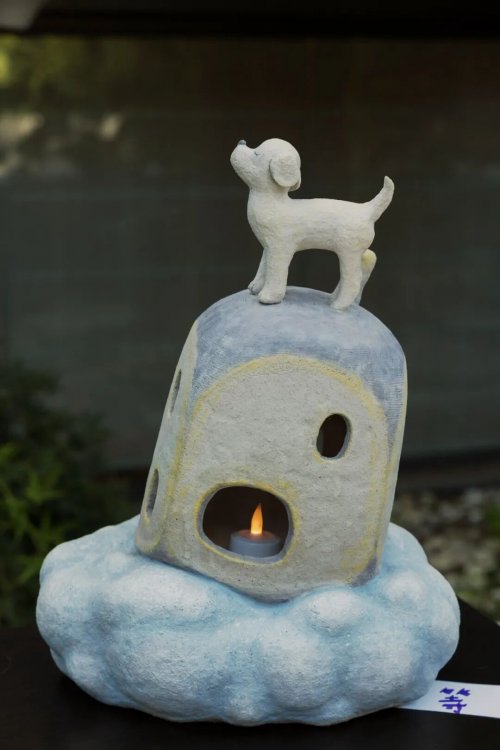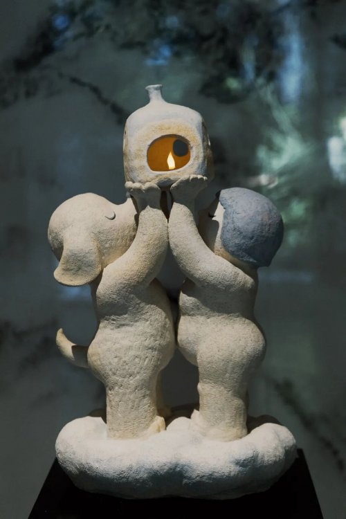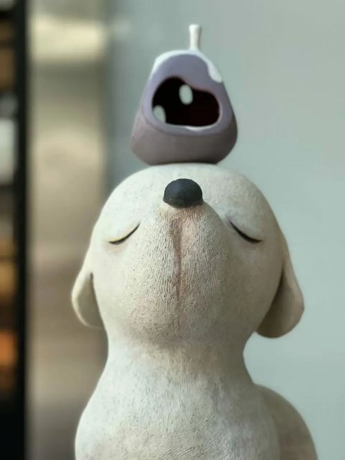 大家看到我狗狗系列作品,一只是阿拉斯加犬大十一,是这只狗真正教会我“什么叫无条件的爱”。所以在他去世以后,我一直希望用艺术来表达我对他的思念之情。今年到景德镇,把我的想法给实现了,大家可以看到最重要的两个雕塑作品“爱”与“愿”寄托着我对他的爱与愿。大十一去世以后,又遇到了小Q,他非常纯真可爱,基于他创作的“乖、等、依、守、家”五件作品就充满童趣、喜悦与温馨,大家可以看到目前所有的作品都是来源于我自己的生活和感受。“