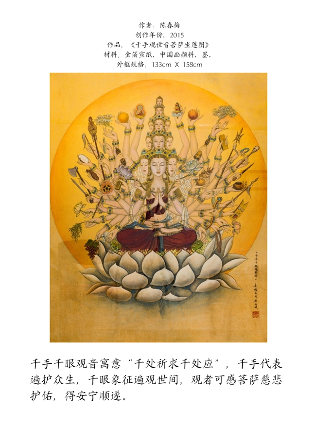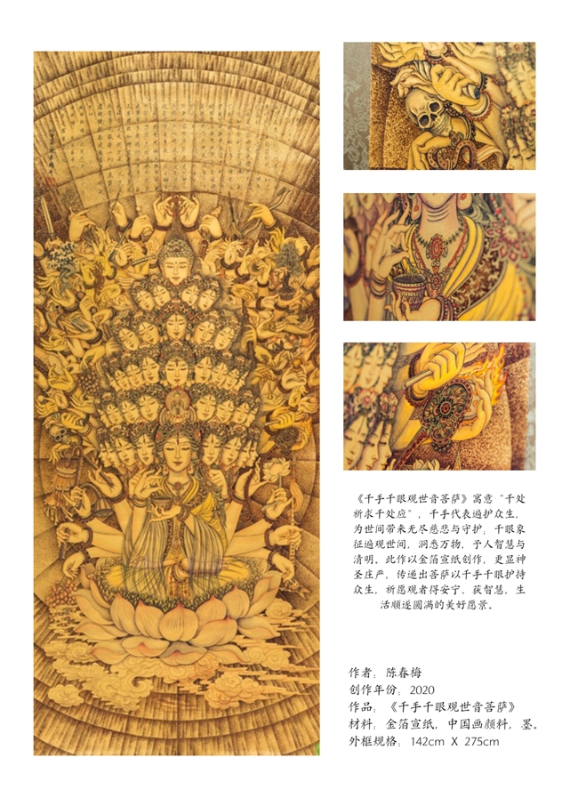 陈春梅以多年深厚画功,赋予观音菩萨创新图像,仿如现代新艺术视野,与传统的敦煌壁画或西藏唐卡的菩萨面风有别。