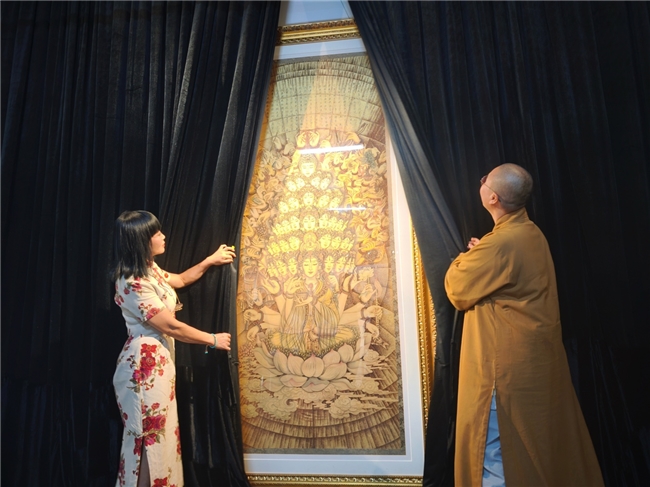 用金箔宣纸及彩墨创作的千手干眼观世音菩萨画像,成为“人生三见”各画展中的焦点。左为陈春梅,右为如彬法师。