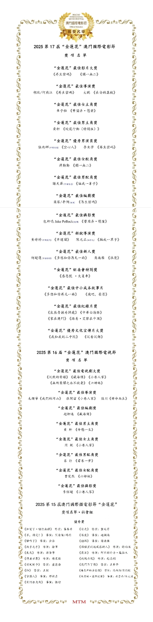 颁奖典礼当晚,澳门美高梅剧院内外光彩夺目,红地毯星光熠熠。两岸四地及海外影视界人士亮相见证第十七届澳门国际电影节「金莲花奖」获奖结果揭晓,本届澳门国际电影节「金莲花奖」各奖项角逐,最终各大奖项归属尘埃落定,核心奖项最佳影片奖由《再生密码》与《独一无二》共同斩获第十七届澳门国际电影节金莲花最佳影片大奖。最佳导演奖由执导《再生密码》的胡玫、何燕江导演组,与执导《长安的荔枝》的大鹏导演共同摘得。最佳男主角奖由黄轩凭借《蛟龙行动(特别版)》荣获。最佳女主角奖由章子怡凭借《酱园弄·悬案》最终实至名归地斩获该奖项;第十六届澳门国际电视节「金莲花奖」揭晓,最佳电视剧大奖由《沉默的荣耀》、《藏海传》、《小巷人家》、《无所畏惧之永不放弃》、《六姊妹》五部电视剧共同荣获第十六届澳门国际电视节金莲花最佳电视剧大奖。最佳导演奖由《小巷人家》导演张开宙、《借命而生》导演陆川、《我们的河山》导演毛卫宁共同摘得。最佳男主角奖由黄轩凭借电视剧《命悬一生》最终荣获。最佳女主角奖由演员闫妮凭借《小巷人家》成功斩获;另外,据26日晚消息,第十五届澳门国际微电影节「金莲花奖」揭晓,包括《澳门不了情》、《守港人》、《狂》、《驴咋了》、《复活》在内的十余部作品获奖,其中《驴咋了》、《狂》、《守港人》是第37届、第38届中国电影金鸡奖“短片金鸡奖”的获奖作品。