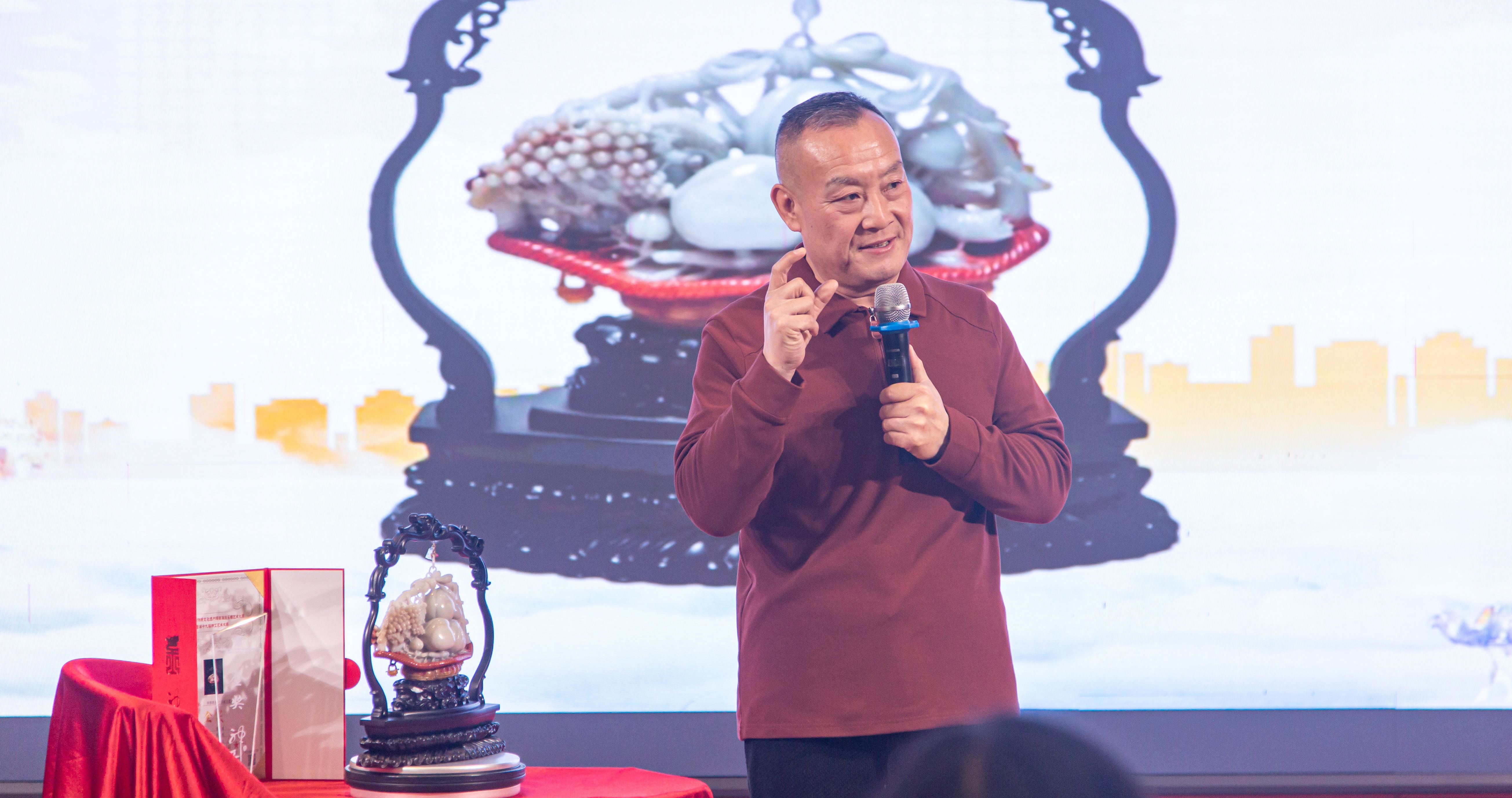 发布会现场,古韵与现代气息相互交融,精心布置的场地充满了浓厚的艺术氛围。在悠扬的古典音乐声中,发布会正式拉开帷幕。首先,中国商业文化研究会艺术与收藏分会执行会长贾晓冬;中国玉文化研究会副秘书长张玉甫;北京市通州区二级巡视员、原通州区文化委主任王立生;北京市通州区文化旅游协会秘书长杜山川先后致辞,中国商业文化研究会艺术与收藏分会副秘书长舒昕主持并对到场嘉宾表示热烈欢迎,并简要介绍了本次发布会的主题和意义,强调了张玉成大师在玉雕领域的卓越成就以及《国福玉篮》作品的独特价值。