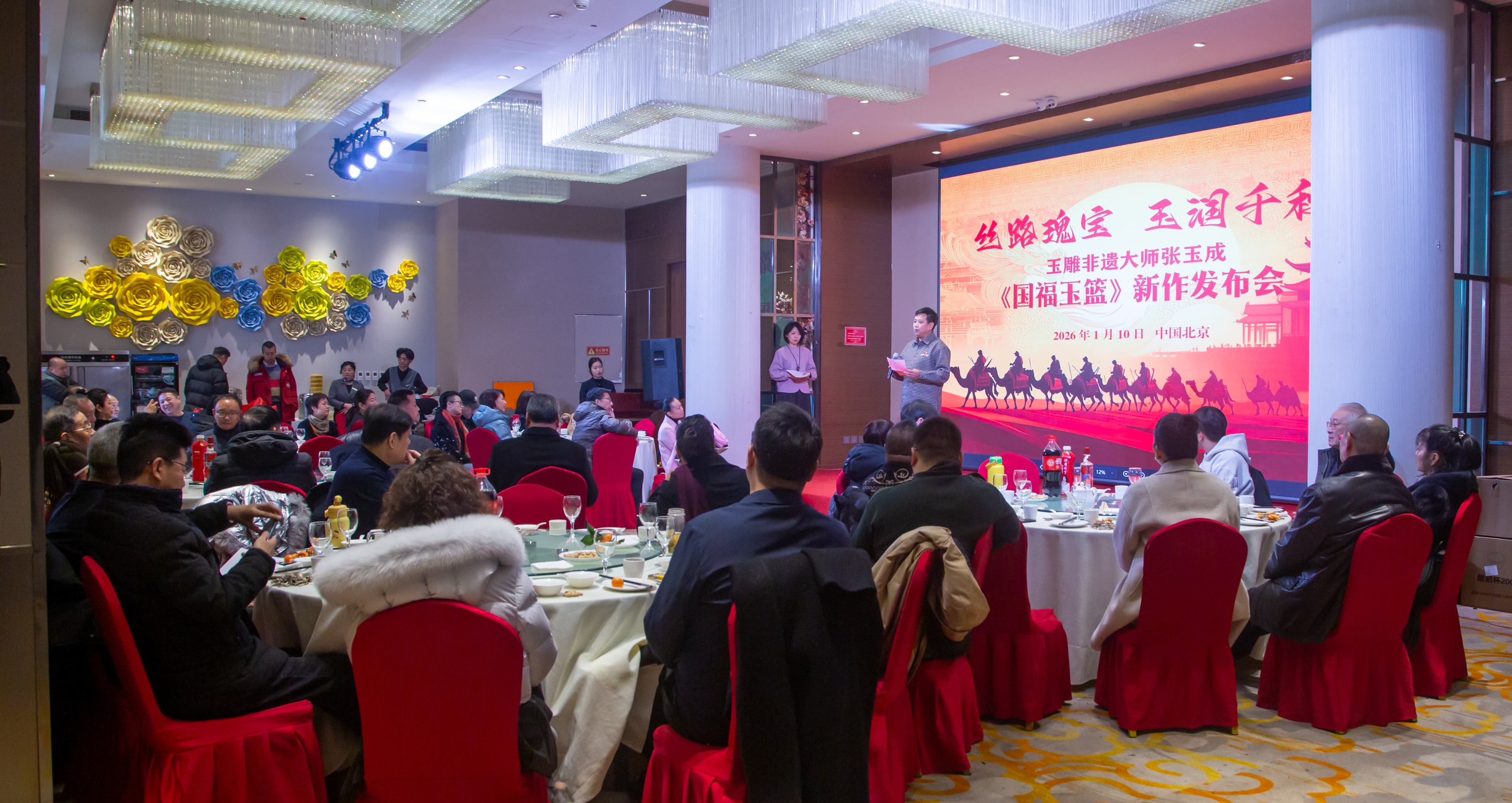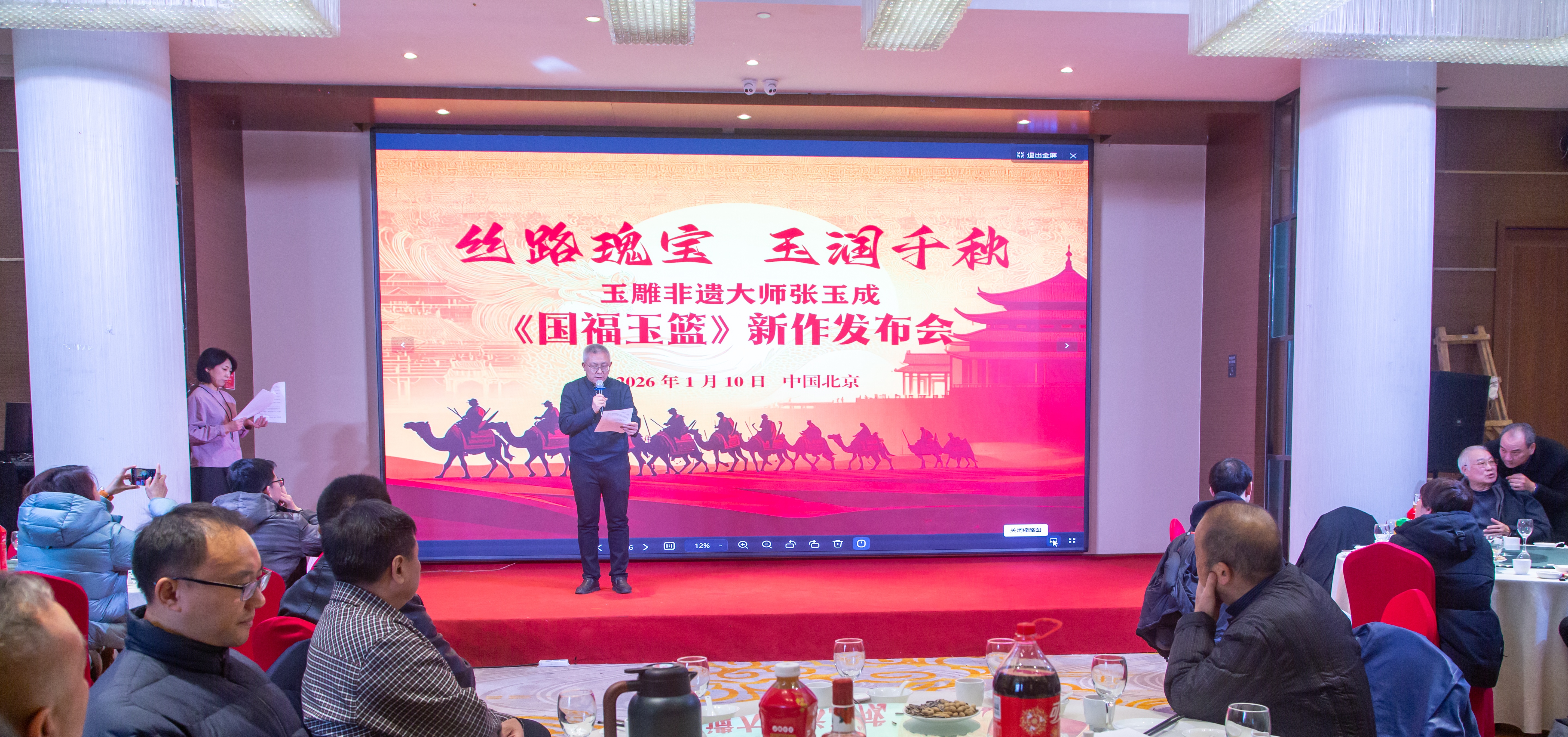 1月10日,在迎接新春佳节之际,一件承载着千年丝路文明与当代匠心的艺术瑰宝——《国福玉篮》,以“丝路瑰宝、玉润千秋”为主题的新作发布会在北京盛大举行。工信部工业文化发展中心工艺美术部部长白彦升;国家级杂项鉴定专家朱克城;中国东方文化研究会国学传承委员会副会长潘旭东;匠学会执行会长兼秘书长张金山;中国传统文化促进会非遗工作委员会副秘书长杨玲艳;珠宝首饰鉴定师、北京锦泓玉品珠宝首饰公司董事长李琼;中国证券报收藏投资导刊负责人苏娟等业内专家、收藏家、媒体记者以及玉雕爱好者齐聚一堂,共同见证这一艺术佳作的惊艳亮相。