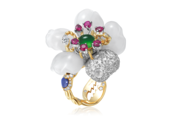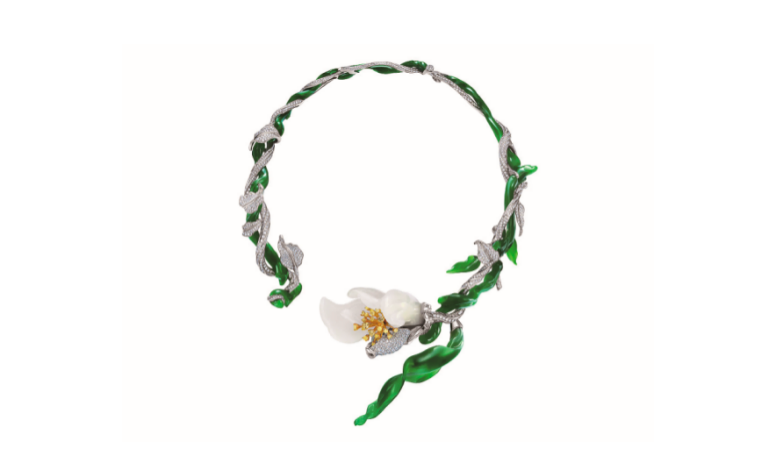 这件作品突破传统珠宝设计常规,不仅以四瓣白玉雕刻出随风摇曳的玉兰花姿,还巧妙地结合了多种材质展现珠宝的美观性与极简主义的精髓。将中国文化的含蓄之美与西方珠宝的结构美学完美融合。
